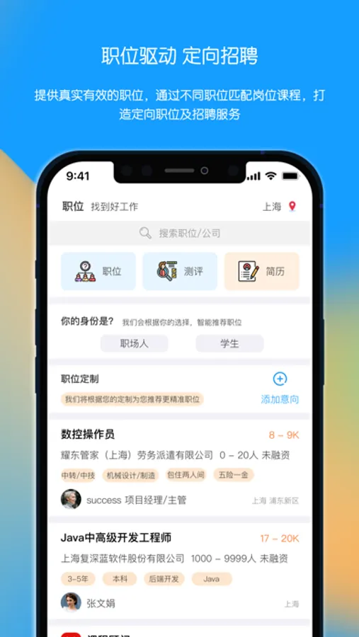 定向就业:职位驱动,定向招聘,通过不同职位匹配岗位课程,打造定向职位及招聘服务。