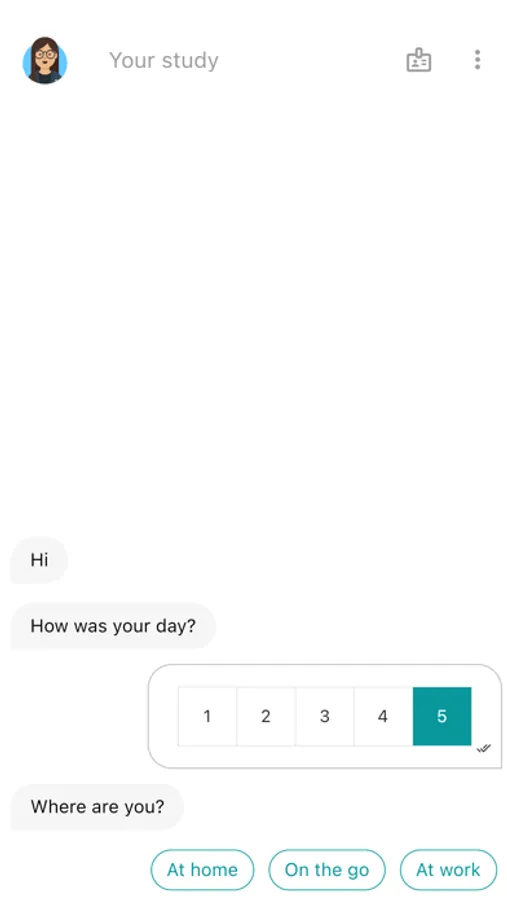 Conversations can be composed by different input and output items, for example as text messages, Likert scales or multiple choice and be triggered by different stimuli, for example by time, by participant need or based on different events.