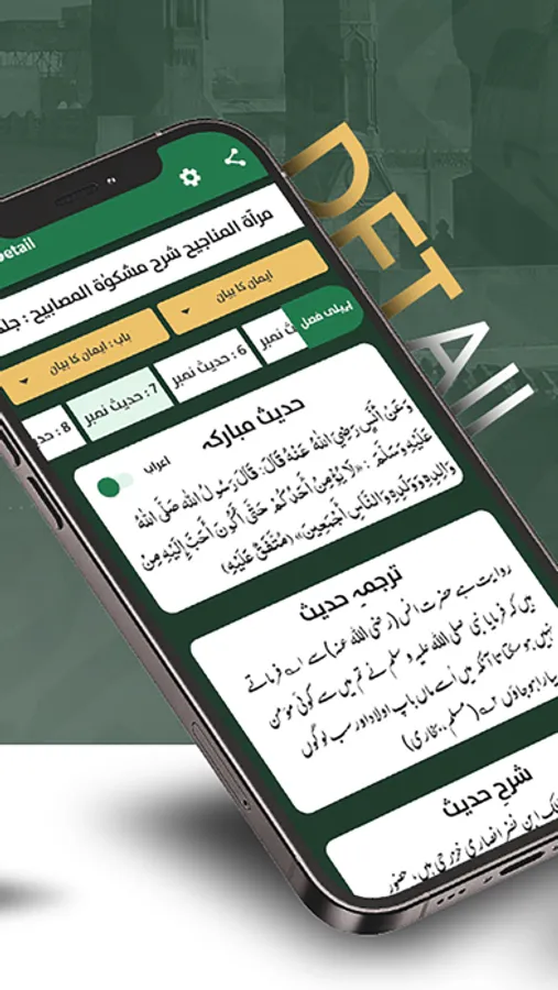 The hadith are written in Arabic text so that users can read the actual Hadees as they were stated by the beloved Prophet Muhammad (peace be upon him).