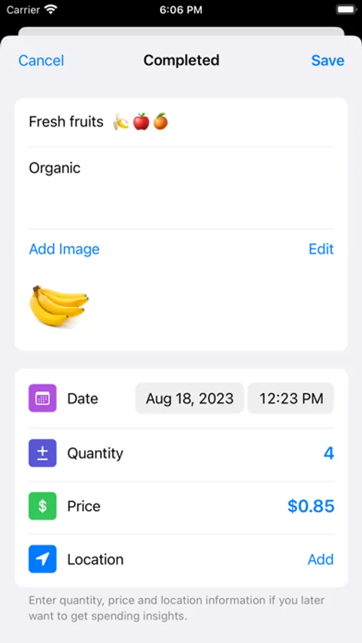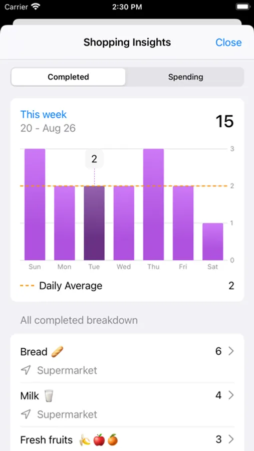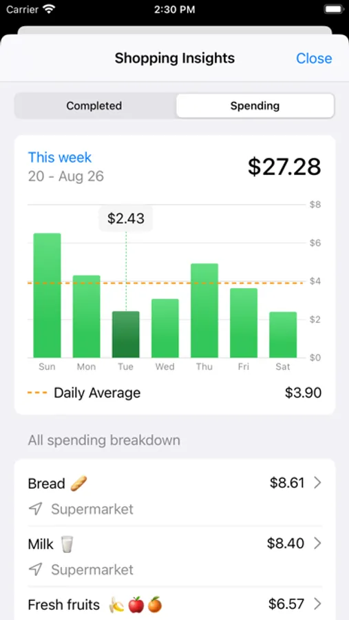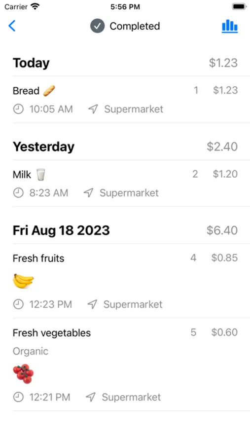 With Shopminders, you'll shop smarter. Enter quantity, price, and location information when completing your lists, and gain powerful insights into your spending and shopping habits generated from your history. Spot trends, discover frequently purchased items, track total spending, and more.