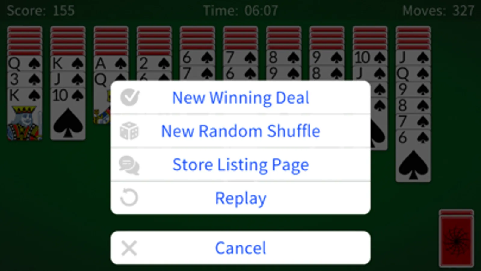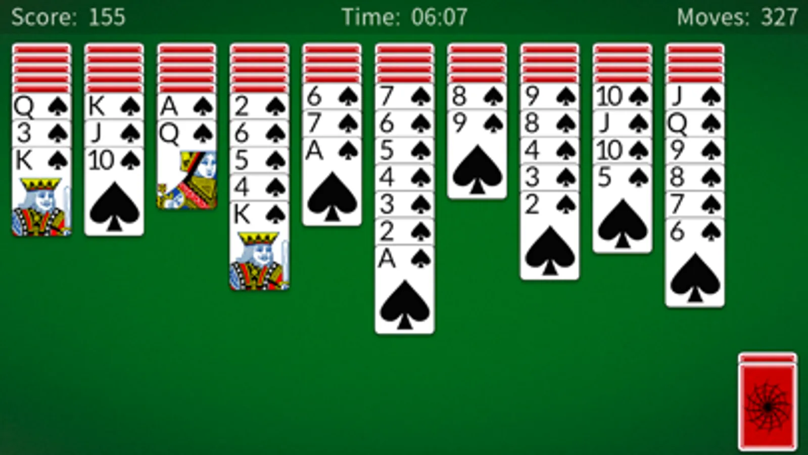 The goal is to assemble 13 cards of a suit, in ascending sequence from ace through king, on top of a pile. Whenever a full suit of 13 cards is so assembled, it is lifted off and discarded from the game. The game is won if all eight suits are played out.