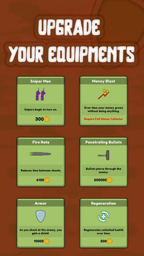 You can buy up to six customizable soldiers, armor, fire speed, regeneration, money collector and many more.