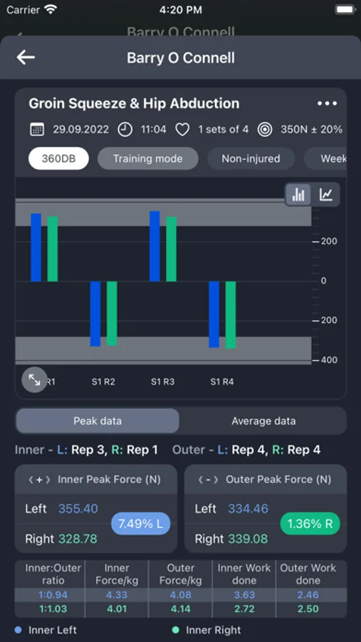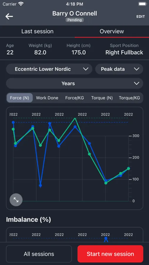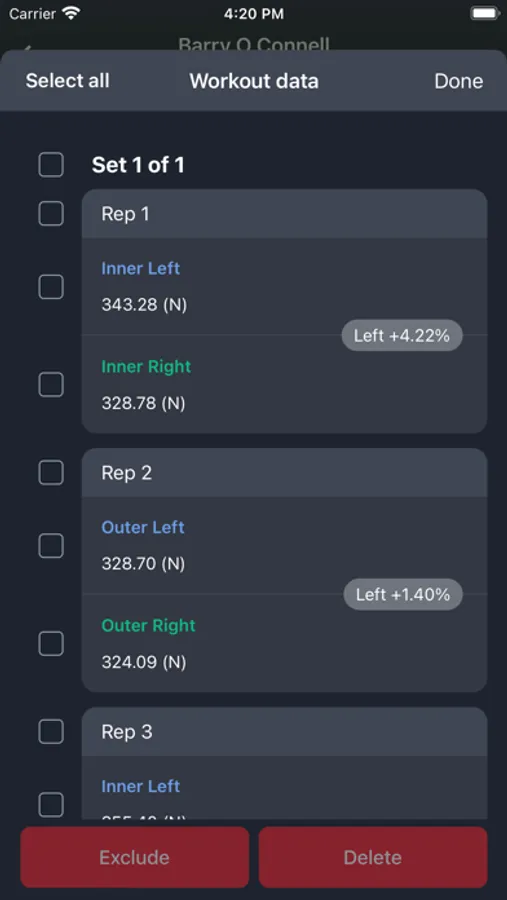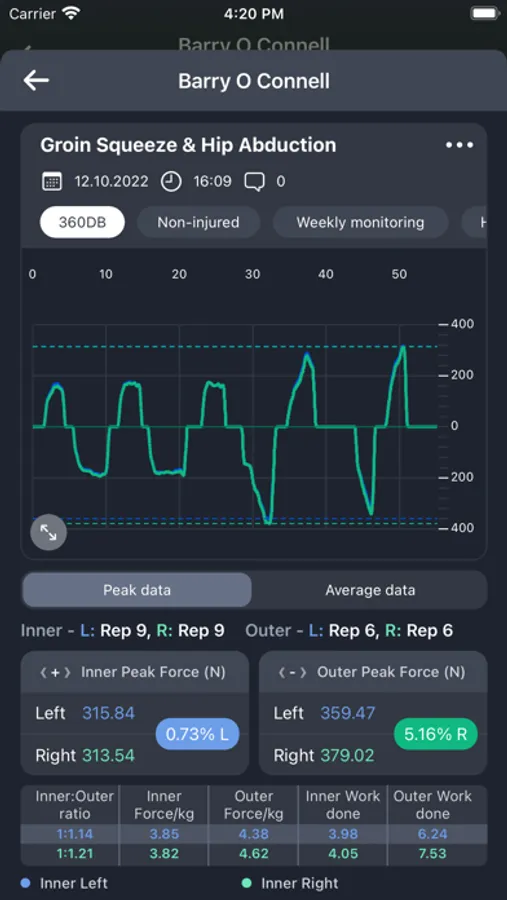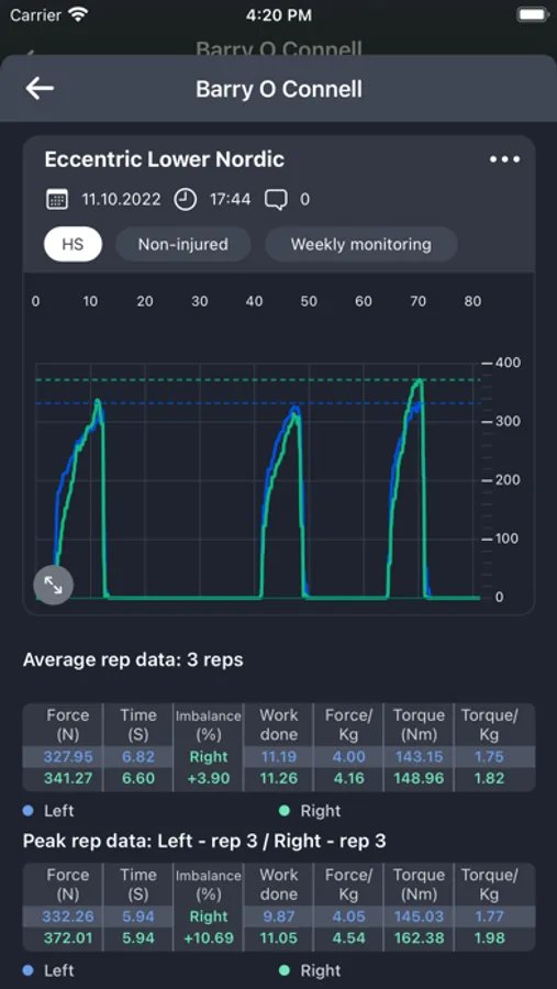 When a user has finished and saved an exercise their performance data such as max strength, imbalance, force/kg, etc. is available to view. This data is automatically uploaded to our Web-App where it can be analysed further using features such as automatically generated graphs, session comparisons and leader boards.