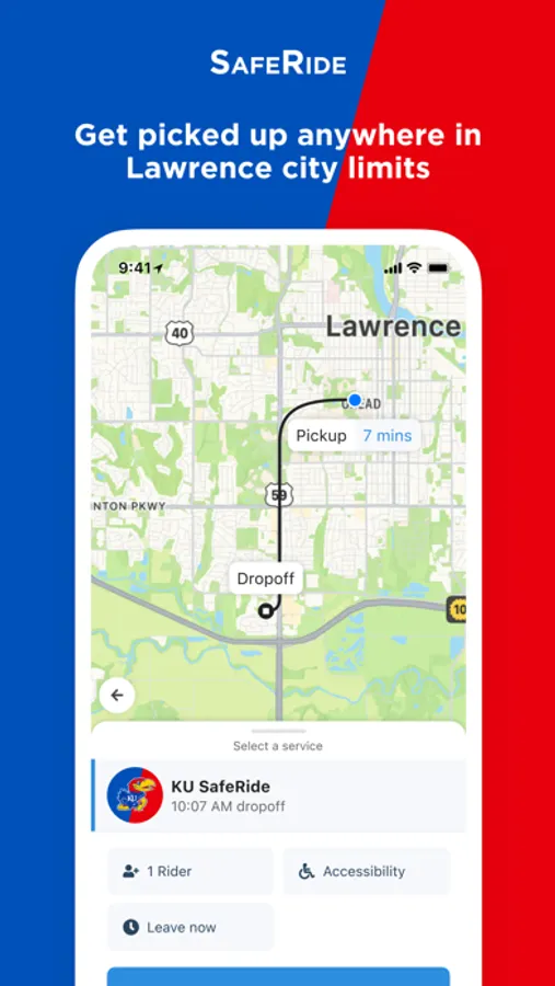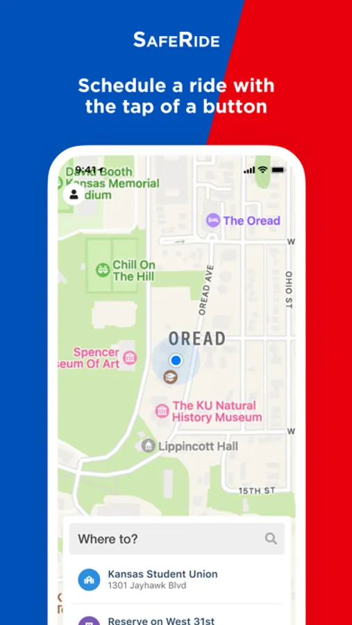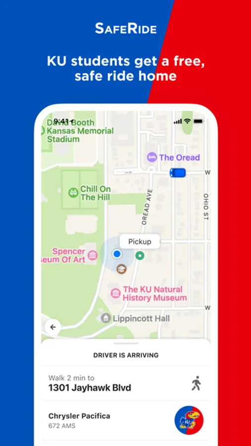 The KU SafeRide app allows students to request a trip home from anywhere inside the Lawrence city limits. Instantly notify drivers of your request, see where they are in real time, and receive a push notification when they arrive.