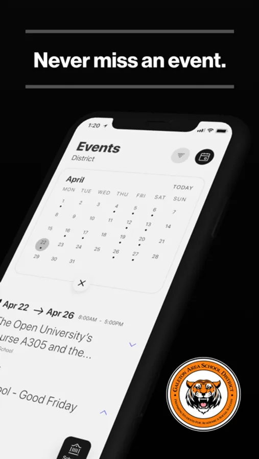 The event section shows a list of events throughout the district. Users can add an event to their calendar to share the event with friends and family with one tap.