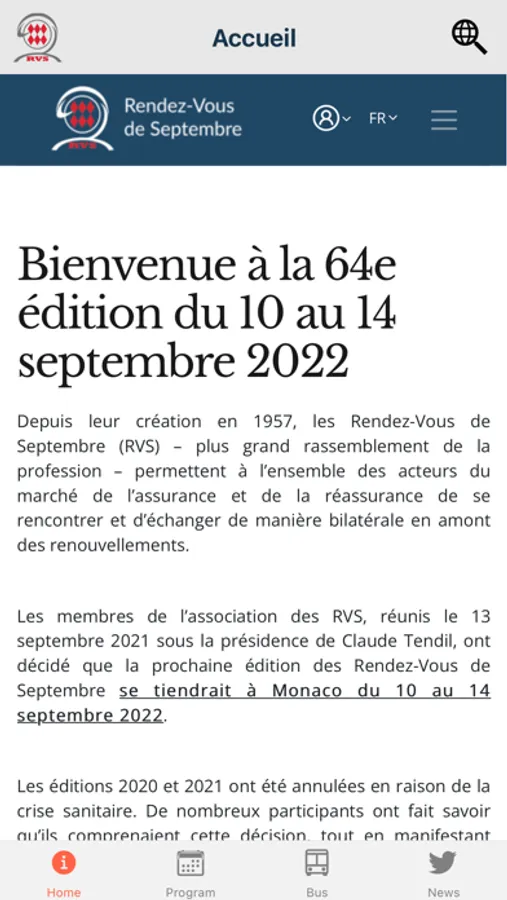 Visualisation des différentes pages importantes concernant les Rendez-vous de Septembre (Accueil, Programme, Carte, News Twitter) via une navigation simple.