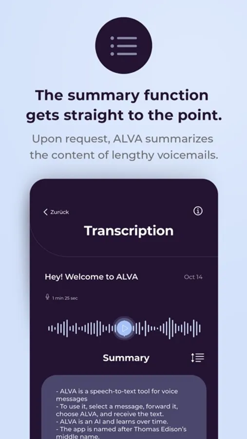 With ALVA, you convert your voice messages into readable text and have the most important points summarized for you. From today, the time of eternal voice messages ends - our artificial intelligence summarizes all your messages in concise bullet points.