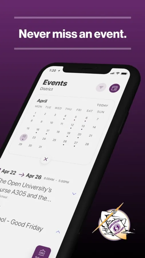 The event section shows a list of events throughout the district. Users can add an event to their calendar to share the event with friends and family with one tap.