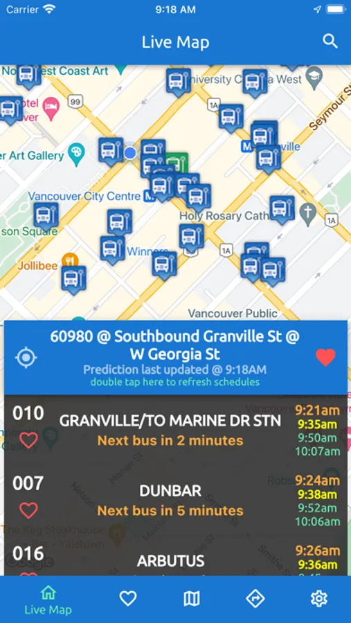 Vancouver Transit Live allows you to comprehensively search Vancouver BC's TransLink bus schedules to get live updates on buses coming to the stops you select.