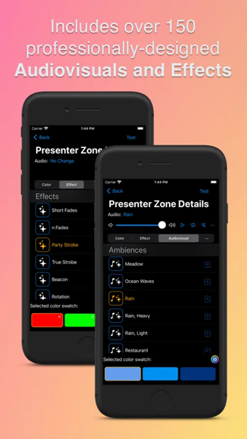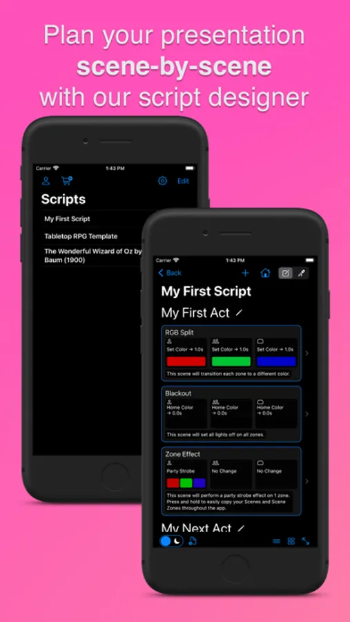 SCENE-BASED SCRIPTS: Creating scripts of light and sound effects has never been easier with Dramatic's highly-configurable, list-based editor. Choose from over 150 professionally-designed Audiovisuals, or play any of the 100+ million tracks included with your Apple Music subscription right from the app. You can also import your own .mp3 and .wav sound files by placing them in the Dramatic folder in the Files app.