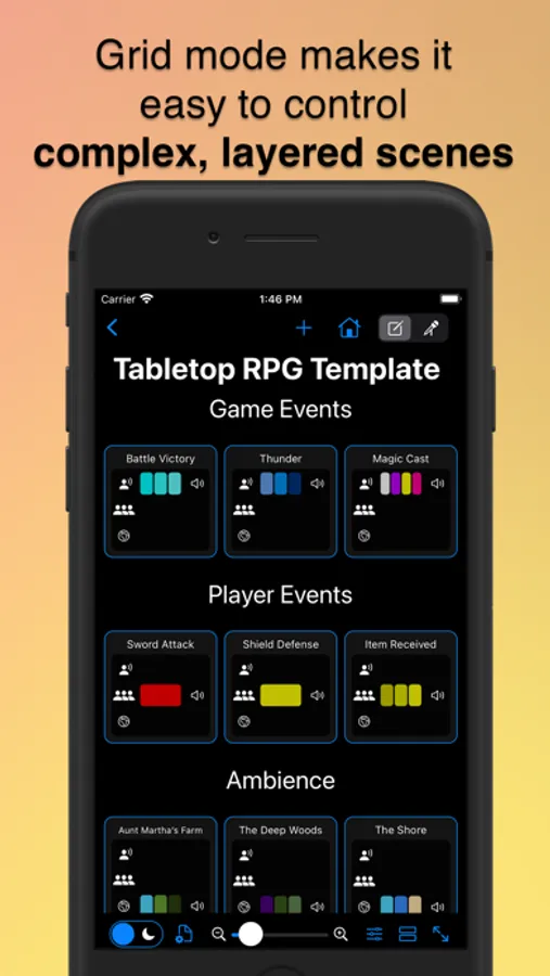 LIGHTING SOUNDBOARD: Add depth and complexity to your presentations with Dramatic's ability to control up to three groups of light and audio sound effects at once. Create layered scenes by configuring ambient background audio sound and lighting effects to set the atmosphere, while playing action effects in the players' lighting zone. Individual volume and loop controls allow you to fine-tune each sound for balance and effect.