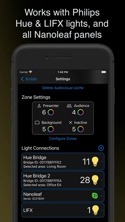 COMBINE LIGHTING HARDWARE: Dramatic works with any combination of Philips Hue or LIFX lights, and Nanoleaf Light Panels. Audiovisuals and Effects are only supported with Hue Entertainment and Nanoleaf. Other lights are limited to audio and color transitions. Hue Multi-Bridge support allows you to control multiple Entertainment Areas in order to exceed the 10-light limit.