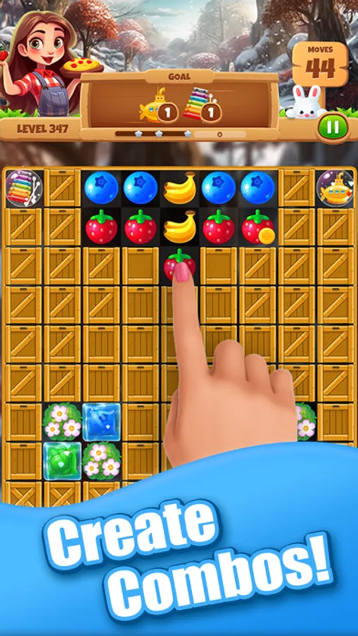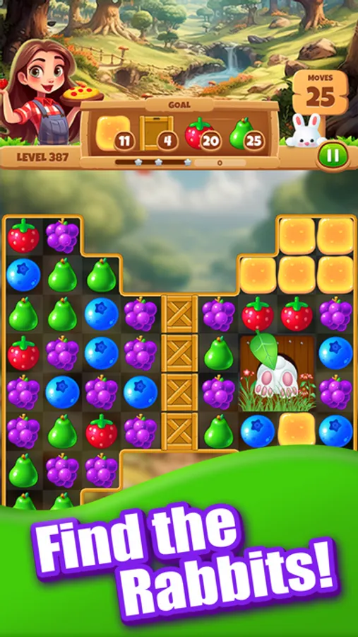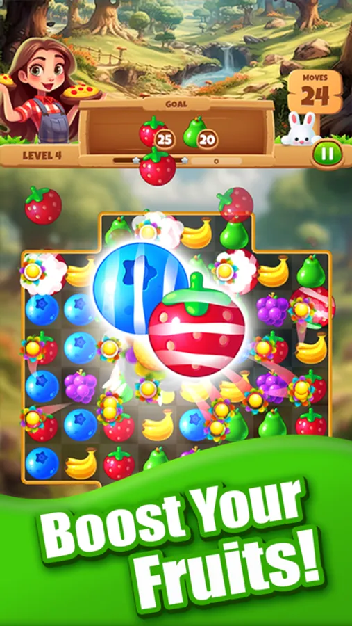 In "Fruit Quest: Match 3," you'll join a thrilling journey through magical forests, brimming with lush vegetation and hidden surprises.