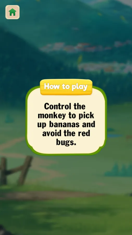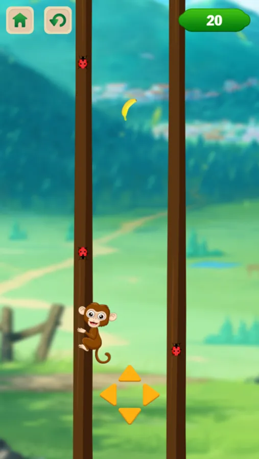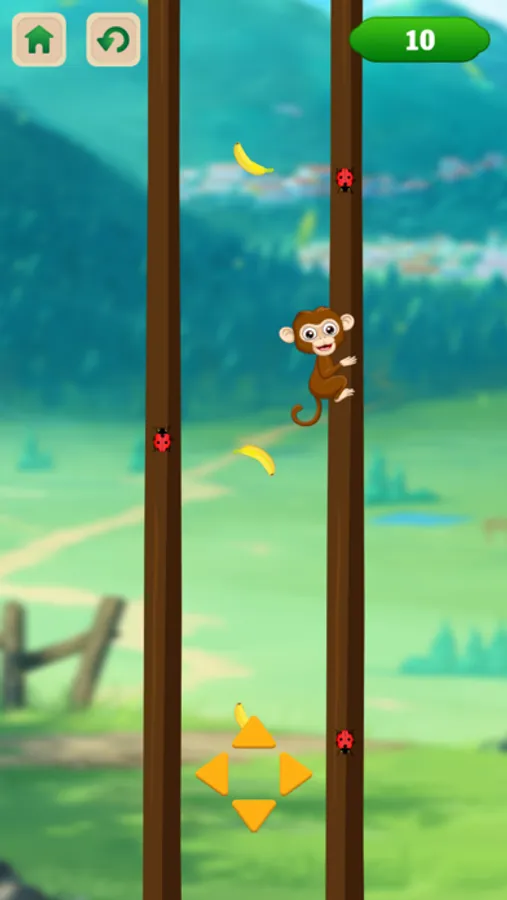 You play the role of a monkey, you stick to the buttons to move the monkey and can move from tree to tree, your task is to eat bananas that hang in the middle of the trees to get 10 points. There will be bugs coming down from the tree, you have to avoid hitting bugs, if you hit bugs you will lose.