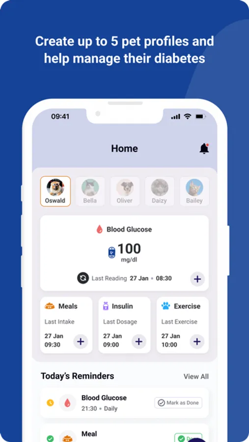 - Set personalised reminders to stay on top of your pet’s blood glucose levels, medication, food and exercise – whatever you need to manage your pet’s diabetes.