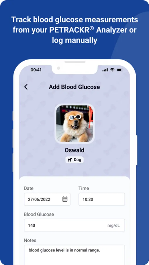 - Link to your PETRACKR® Blood Glucose Analyzer so all blood glucose measurements are transferred to the PETRACKR® App