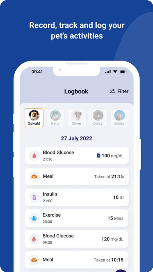 - All activities (blood glucose measurements, insulin doses, meals and exercise) are automatically logged to your pet’s Logbook.