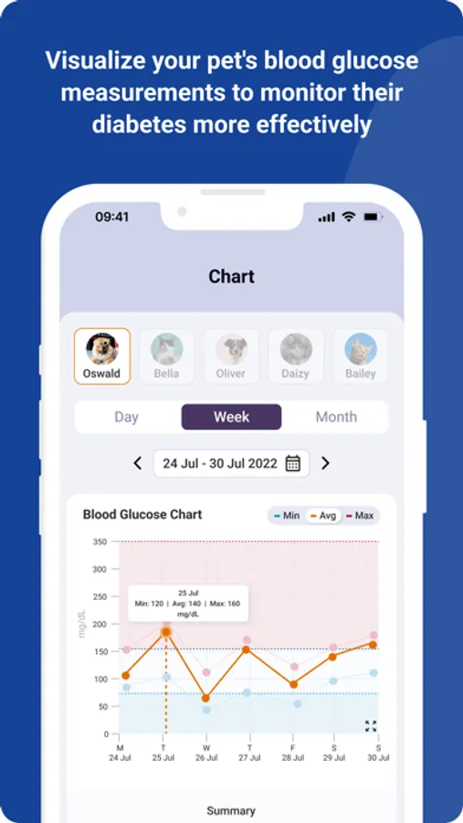 - Visualise your Pet’s blood glucose measurements in the form of colourful charts over daily, weekly or monthly timeframes. This allows you to quickly and clearly identify whether your pet’s blood glucose is in the appropriate range and identify any trends. Summary statistics of your pet’s minimum, maximum and average blood glucose results as well as the number of measurements in range, below range and above range are also provided.