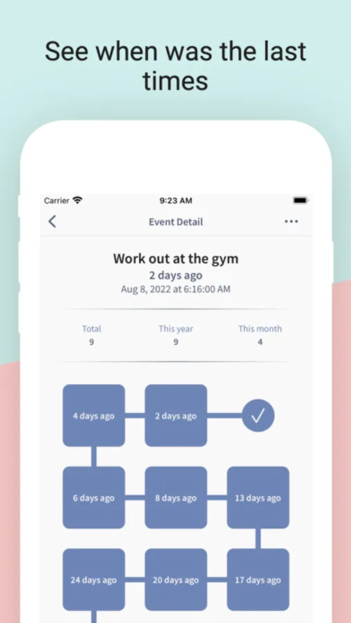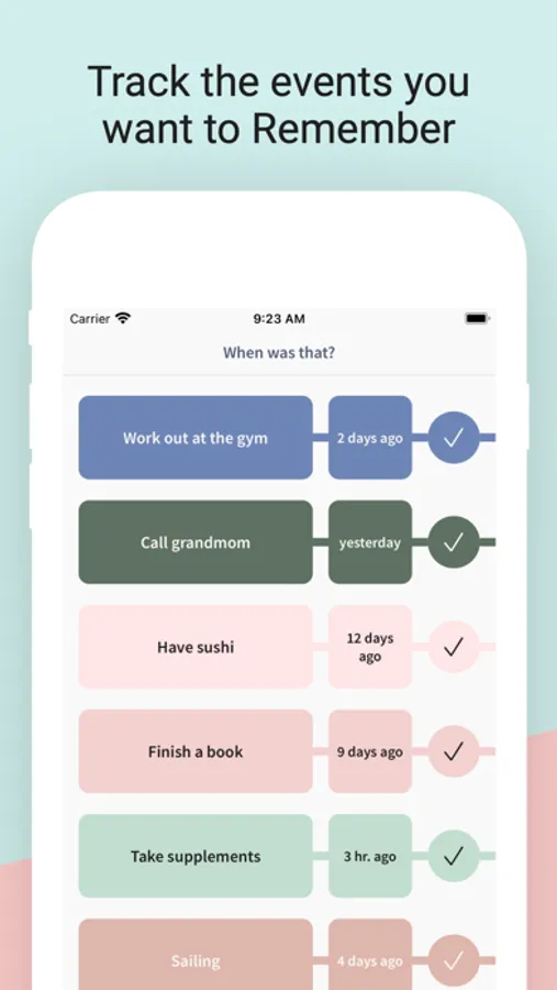 1- Timely Reminders: "When was that?" ensures you never forget the last time you experienced something special. Stay on top of your cherished moments, from attending a movie, visiting the dentist, to enjoying a skiing trip.