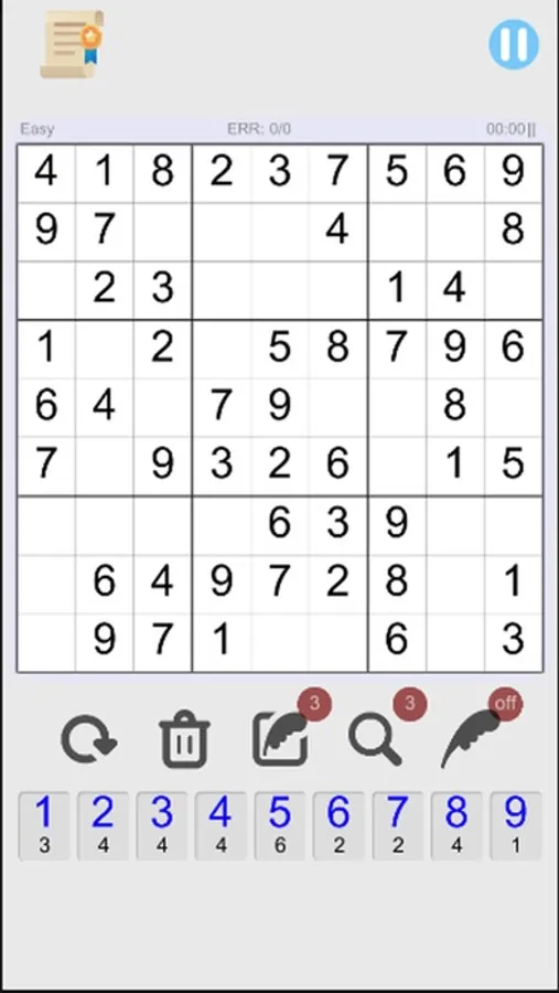 The game contains four levels: Easy, Normal, Hard, and Expert, and more than 1000 classic Sudokus are waiting for you to solve the puzzle