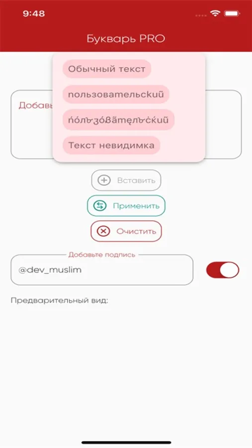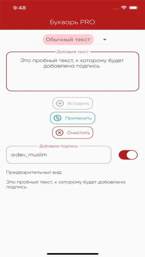 Пользуетесь активно соцсетями и устали к каждому сообщению добавлять свои ссылки и хештеги? Выход есть! Используйте данное приложение для подписания ваших текстов. Приложение очень простое и легкое в использовании. Все операции с текстом происходят при помощи трех кнопок: вставить, применить и очистить. Вы просто добавляете нужную вам подпись и активируете ее добавление, затем, лишь только вставляете нужный вам текст и копируете его с подписью.