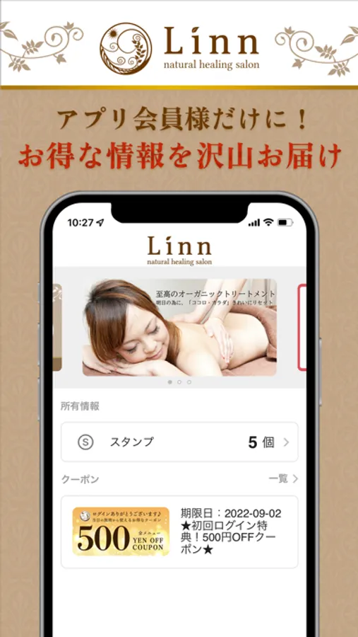 Linn恵比寿 -natural healing salon-の【公式アプリ】が登場! アプリを通して新着情報やお得な限定キャンペーン・クーポン等の情報を受け取ることができます。また24時間いつでもお手元のスマートフォンから、リラクゼーション施術メニューやご来店希望の空き時間チェック・ご予約が可能です。アプリをインストールしていただくことにより、Linn恵比寿をより便利に身近にご利用いただけます。 紙の会員カードは持ち歩かなくてももう大丈夫です。