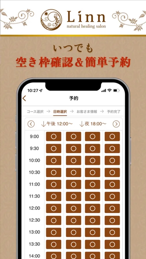 24時間いつでもお手元のスマートフォンから、施術メニューやご来店希望の空き時間チェック・ご予約が可能です。