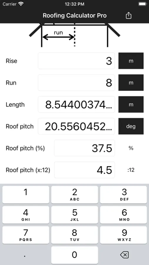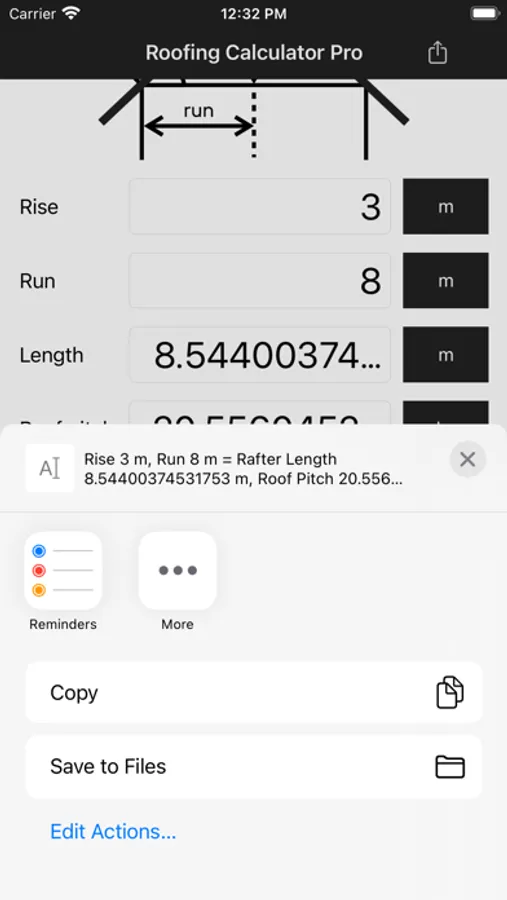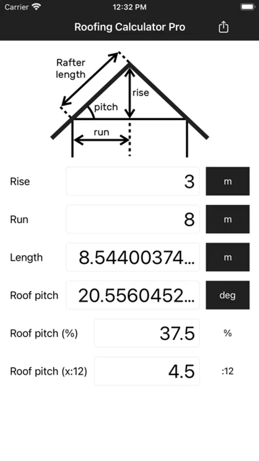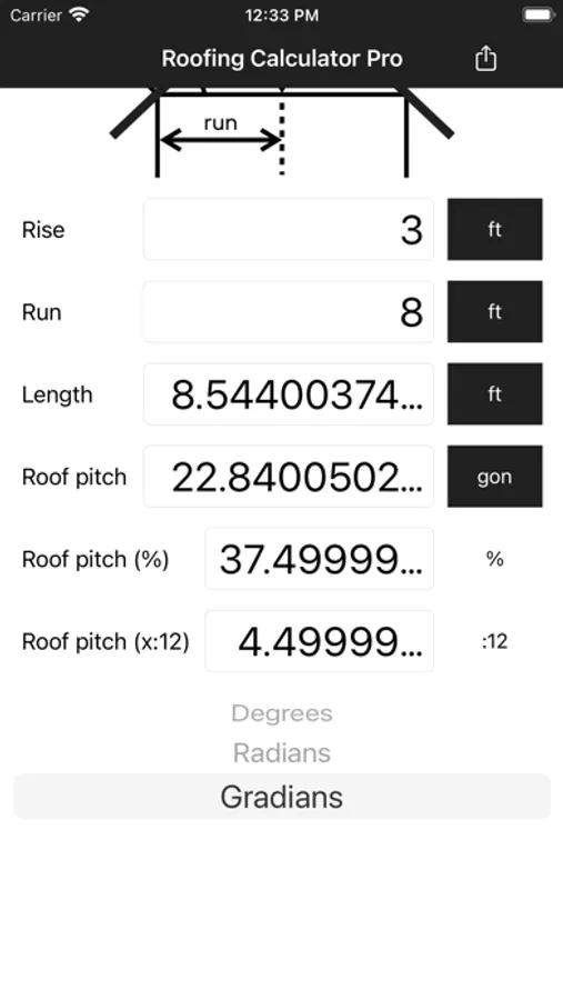 Roofing Calculator Pro can also quickly determine Roof Pitch and Rafter Length based on Rise and Run expressed in: