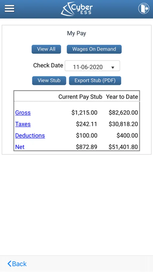 Download this app if directed by your employer or payroll provider. If your payroll is processed using software produced by CyberPay, Inc., such as CyberPay Online, then this app will allow you do download your pay stub and annual tax forms (W-2, 1099, etc.). This app will allow you to access the ess.cyberpayonline.com ESS portal. Additional services may be available, if offered by your employer.
