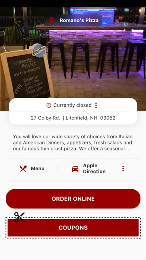 Romano's Pizza restaurant app has many different functions. It contains an online ordering link, restaurant images, address, driving directions, store hours, menus, and many other great features.