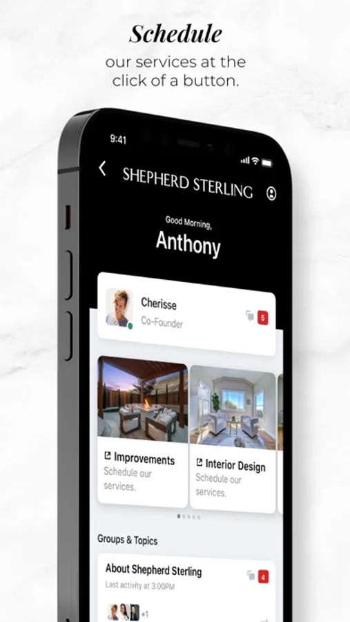 Shepherd Sterling reimagines your residential & commercial spaces through inspired Improvements, Interior Design and Furnishings. Efficiency is at the cornerstone of our values. As professional designers and logistics experts, we know that for any design project to succeed, it requires streamlined communications and process efficiency. The Shepherd Sterling App provides an interactive one-stop platform for scheduling our services, communicating with our teams via voice, video and instant messaging, and efficiently collaborating with us on your projects from start to completion. Securely share files, collaborate on documents, e-sign documents, receive real-time updates on your projects, shop our art, furniture and decor collections and more with the Shepherd Sterling one-stop App.