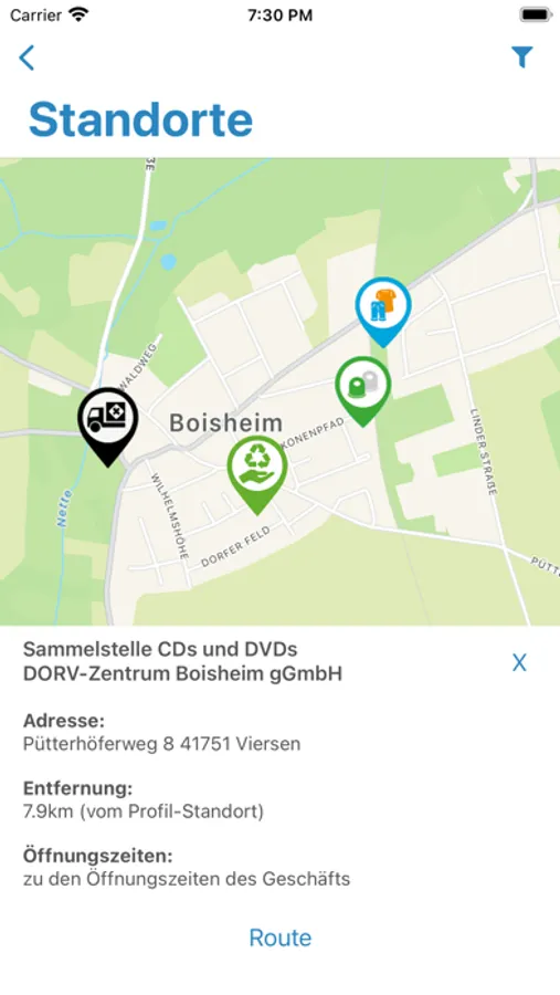 • eine Übersicht aller Entsorgungsstandorte mit Öffnungszeiten und einer Routingfunktion