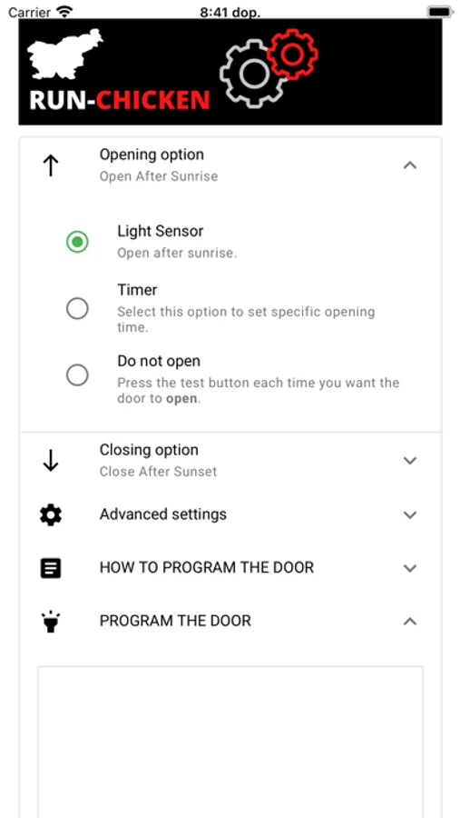 With this app, you can configure the RUN-CHICKEN door. You can set opening options (timer, sunrise) and also closing options too.