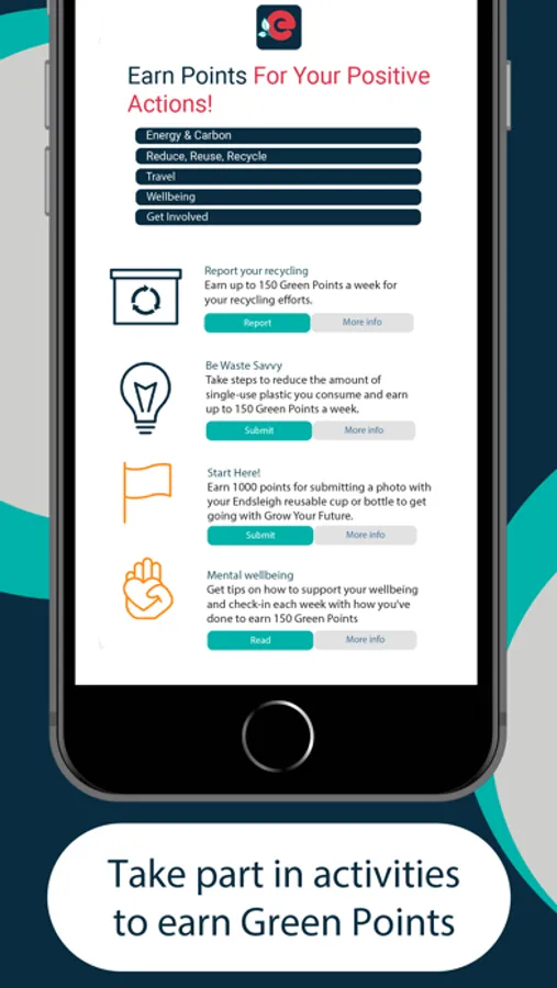 With this app you will be able to earn Green Points for your actions in themes including Energy and Carbon, Travel, Health and Wellbeing, Reduce Reuse and Recycle, and Get Involved.