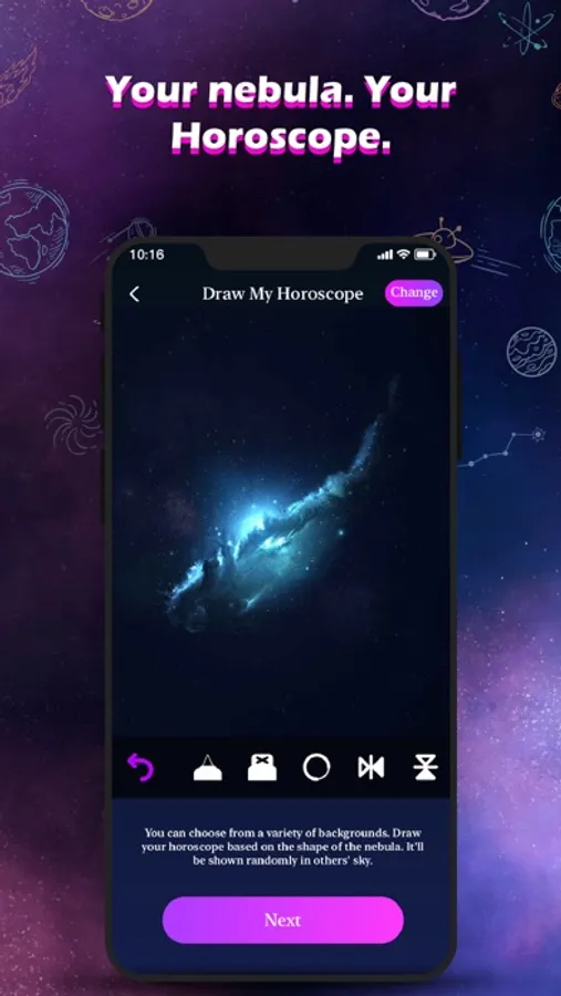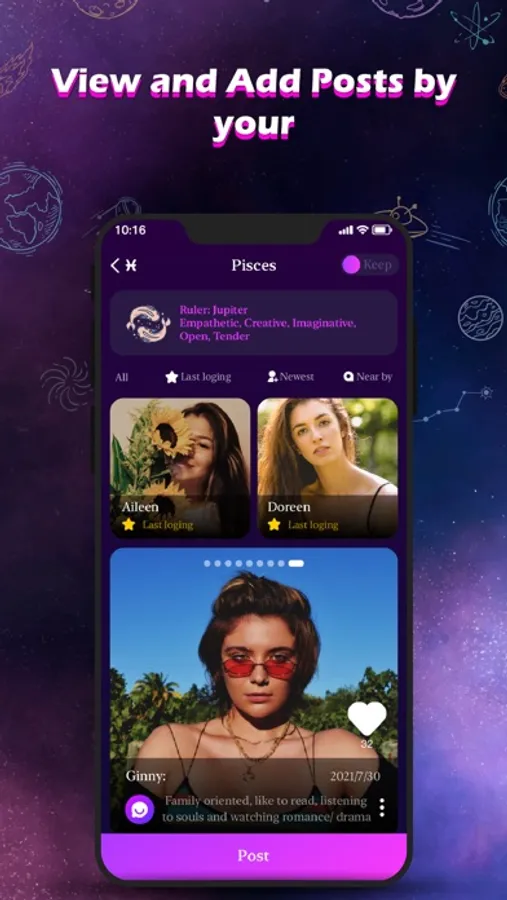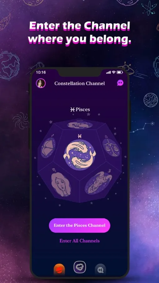 There are 12-sided planets in interstellar space, with each face representing an entrance to a horoscope planet. Users can choose their favorite constellation from the 12-sided planet to enter the horoscopes planet of their choice. You can witness the beautiful lives that the people on this planet have captured and shared after entering the horoscopes planet you have picked.