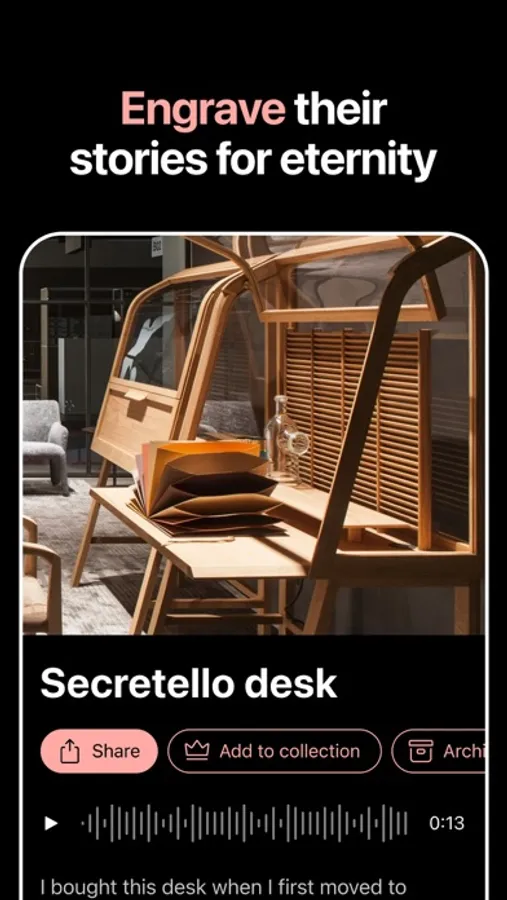 Catalogue your objects alongside their stories (audio/notes) and recommend the objects you love.