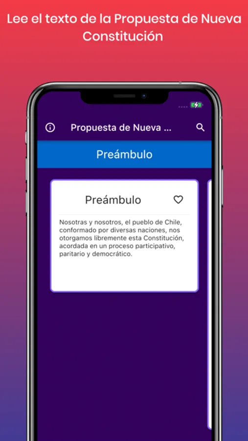 Nota: Esta es una aplicación no oficial, que no está relacionada con el gobierno de Chile ni con los ejecutores del proceso constituyente. Es sólo un esfuerzo individual y altruista para contribuir a la difusión de información objetiva sobre el proceso constituyente. Se entrega el texto íntegro de la propuesta de nueva constitución incluyendo preámbulo, artículos y disposiciones transitorias.