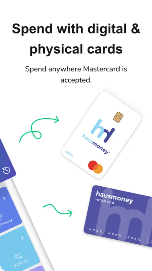 hausmoney ™ virtual and physical Mastercard debit cards can be added to your digital wallet. If keeping a physical card in your pocket isn’ your vibe, go ahead - roam the universe and spend through Apple Pay or Google Pay!