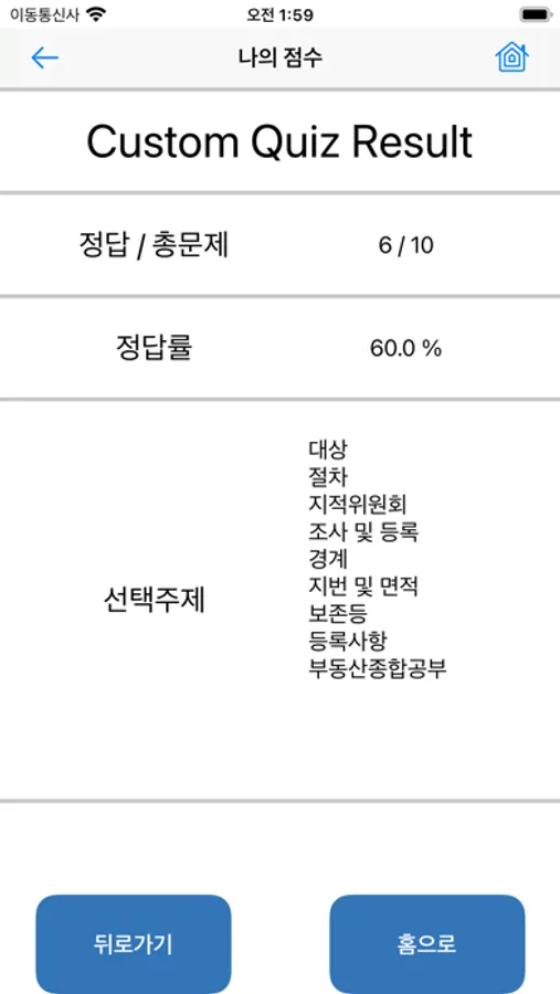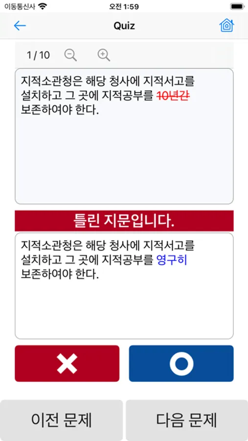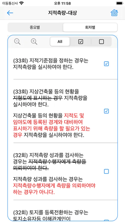 정말로 정확히 외운 건지, 외운 것 같은 느낌적인 느낌인지는 문제를 풀어야만 확인할 수 있습니다. 옳은 지문은 옳은 지문이 원문 그대로 실려 있고, 틀린 지문은 어디가 어떻게 틀렸는지에 대한 표시가 되어 있어서 개념을 이해하고 암기하는 데 어디에 중점을 두고 공부해야 하는지, 문제를 출제할 때 출제자가 어느 부분에 어떤 함정을 파는지를 한눈에 파악할 수 있습니다. 주제별로 득점 현황도 확인할 수 있어서 자신이 어느 정도나 암기가 되었는지를 확인할 수 있고 덜 외운 지문들, 중점적으로 봐야 할 지문들은 체크해두었다가 체크한 문제들만 모아서 풀 수 있는 기능이 있으니 오엑스 퀴즈 100점이 나올 때까지 반복적으로 학습해보세요.