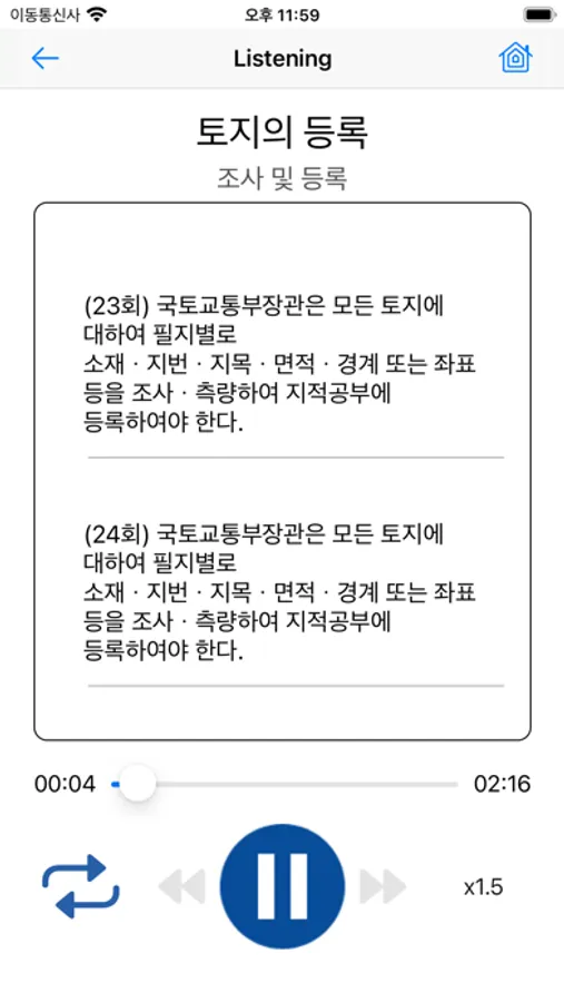 이 앱은 기출지문을 읽어주는 오디오 기능이 탑재되어 눈으로는 기출지문을 읽으면서 귀로는 기출지문을 듣는, 시각과 청각의 콜라보를 통한 입체적인 학습을 가능하게 합니다. 이 기능을 이용하여 라디오를 듣는 느낌으로 출퇴근할 때 버스나 지하철 안에서, 운전할 때, 설거지나 청소 등 집안일을 할 때 등, 공부에 집중하기 어려운 자투리 시간을 활용하여 틈틈이 기출지문을 틀어서 귀에 반복적으로 노출시킨다면 뇌새김 효과로써 기출지문을 익숙하게 만들고 더 나아가 암기하는 데 큰 도움이 될 것입니다.