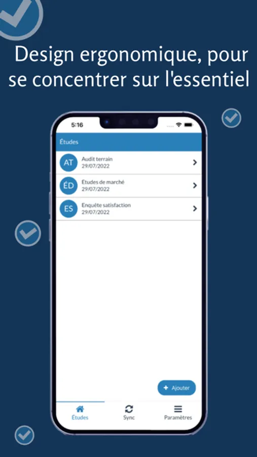 Plusieurs enquêtes et opérations peuvent être gérées simultanément. Au lancement de l'application, un menu permet de sélectionner l'un des formulaires disponibles ou de cliquer sur le bouton de synchronisation. Cette fonction renvoie vers le serveur les données saisies et récupère du serveur les nouvelles enquêtes ou formulaires déclarés pour cet équipement mobile.