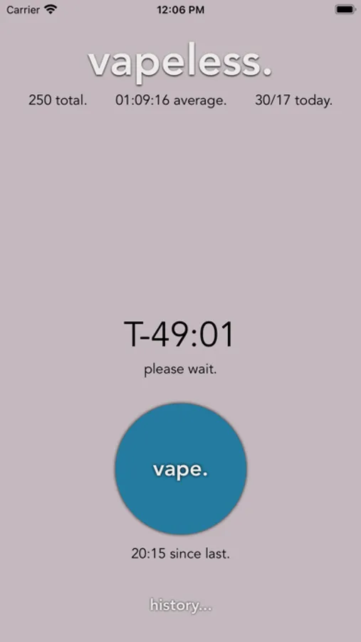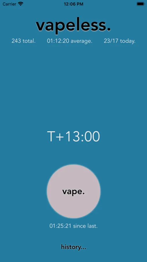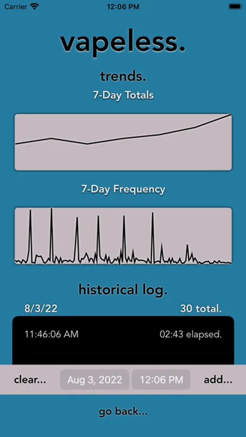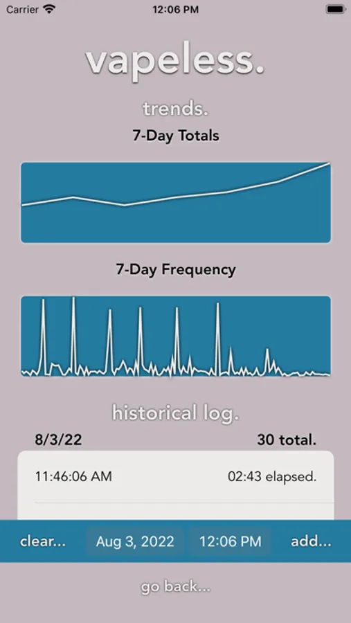 When tracking consistently, the average time between sessions are calculated. The visual state of the app makes it clear when a session will increase or decrease your average. Front and center, in a minimal interface, are the stats and info needed to taper your habit. Trend charts and a full log of sessions are available to highlight recent progress.