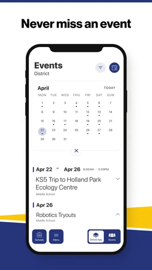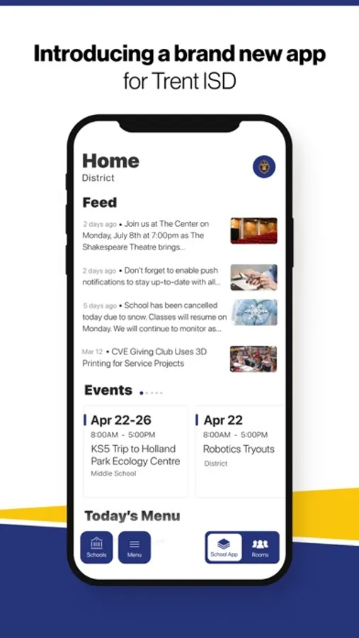 The event section shows a list of events throughout the district. Users can add an event to their calendar to share the event with friends and family with one tap.