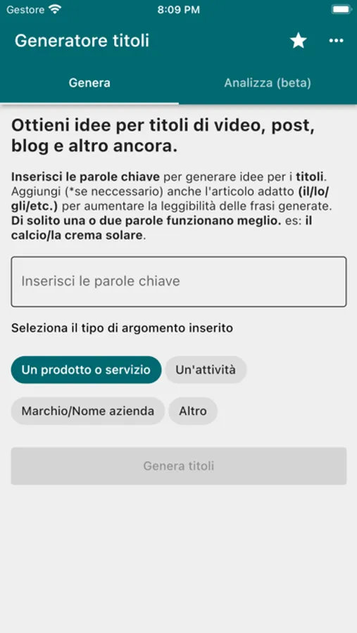 L'applicazione è un generatore di titoli per post, blog o video. Attraverso un catalogo in crescita di oltre 500 frasi disponibili è possibile avere spunti sui titoli riguardanti i propri argomenti.
