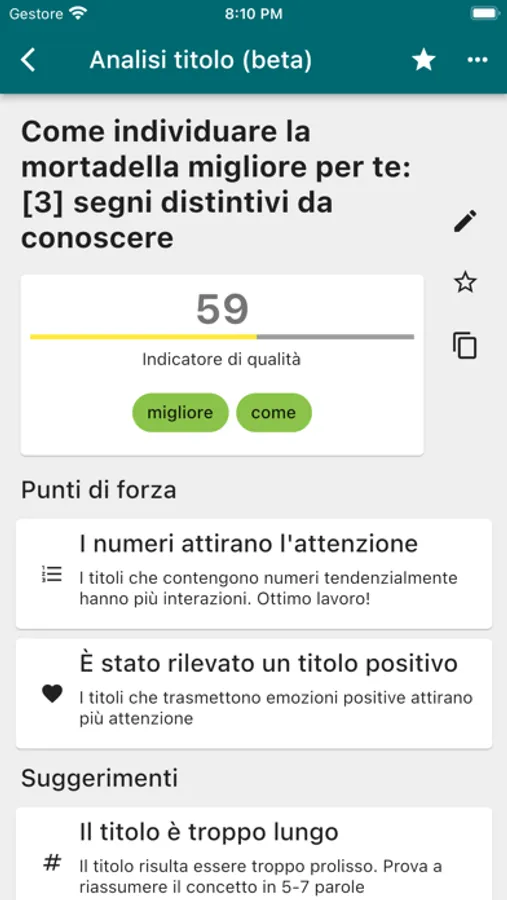 All'interno dell'applicazione è possibile trovare anche un analizzatore (in versione beta) che esegue vari controlli e sentiment analysis su una determinata frase, assegnando un punteggio in modo da evidenziare le caratteristiche che possono renderla una frase di successo.