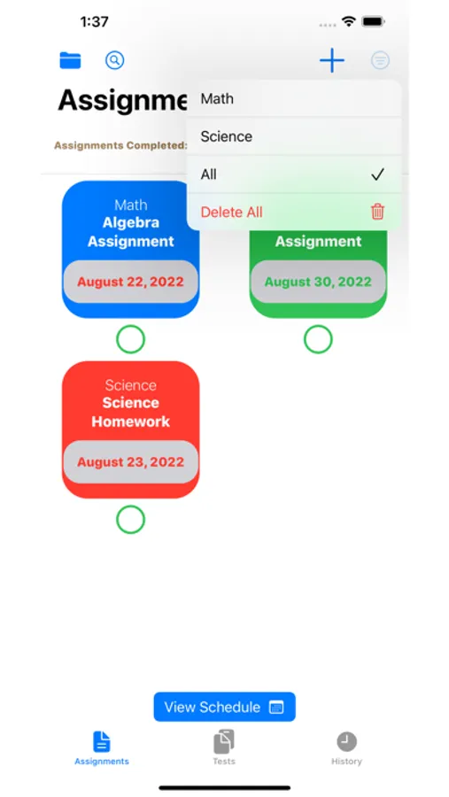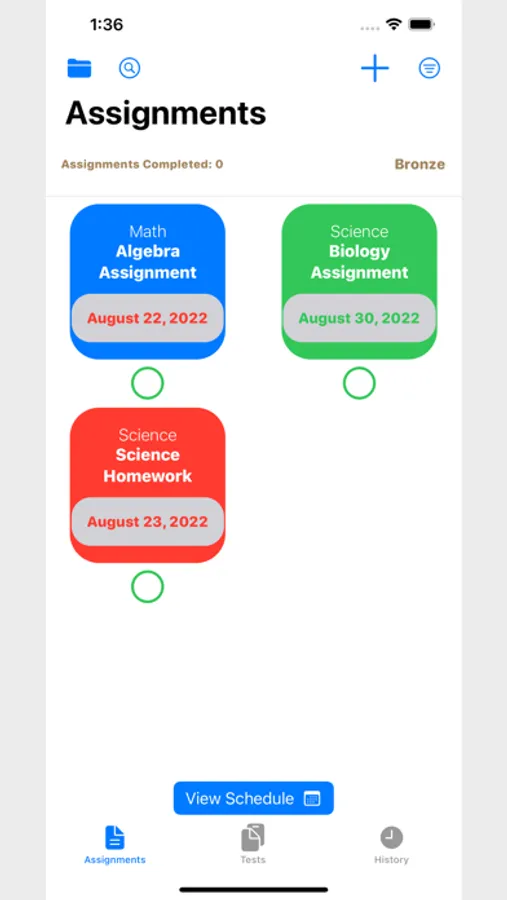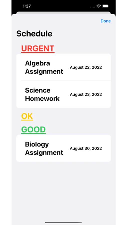 This app, along with graphically organizing all you assignments, tests, and study sessions, provides early reminders to notify you when those events are coming up so that you never miss the deadline ever again. It includes the complete tool kit for keeping your school year on track, with assigned topics, notifications, and graphics that adapt accordingly to the assignment's due date, so that you can get all the details you can get, at just a glance. This is just the beginning, this app will continuously be updated to meet the busy school schedule that many follow everyday. Hope to be very impactful to your performance at school!