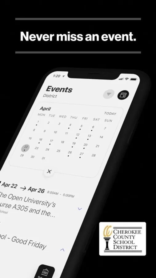 The event section shows a list of events throughout the district. Users can add an event to their calendar to share the event with friends and family with one tap.