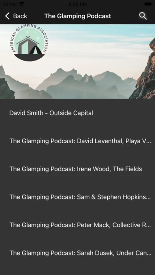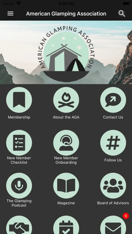 Member Directory, The Glamping Podcast, Member Meet Up Recordings, Blog, Calendar, Member Check in, Notifications.