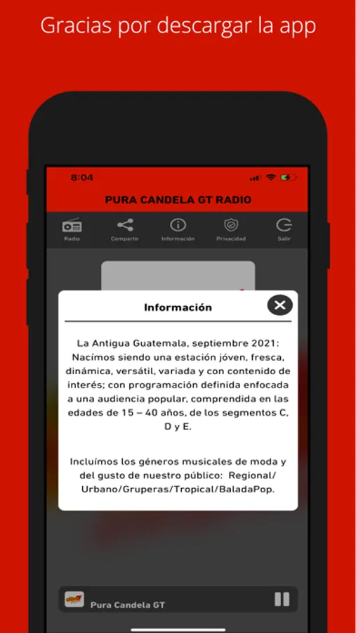 La Antigua Guatemala, septiembre 2021: Nacimos siendo una estación joven, fresca, dinámica, versátil, variada y con contenido de interés; con programación definida, enfocada a una audiencia popular, comprendida en las edades de 15 – 40 años, de los segmentos C, D y E. Incluimos los géneros musicales de moda y del gusto de nuestro público: Regional/Urbano/Gruperas/Tropical/BaladaPop.