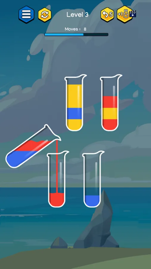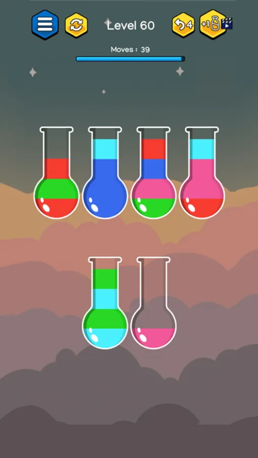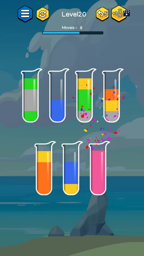 - Sort the colors into the tubes until each has its own color to complete the challenge